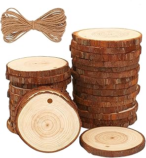 Shuny 30 pcs Tranches de Bois Naturel, Bois Tranches de Disques 5-6cm avec Trous, Rondelles de Bois disques en Bois, with 10M Corde de Jute Bois Etiqutte Naturel pour Bricolage DIY Mariage Carte
